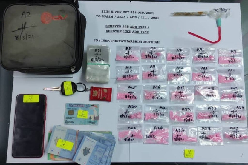 “Kami juga menemui peralatan yang dipercayai digunakan untuk menyedut dadah, beg plastik kecil, RM362, SG$19 dan telefon bimbit.