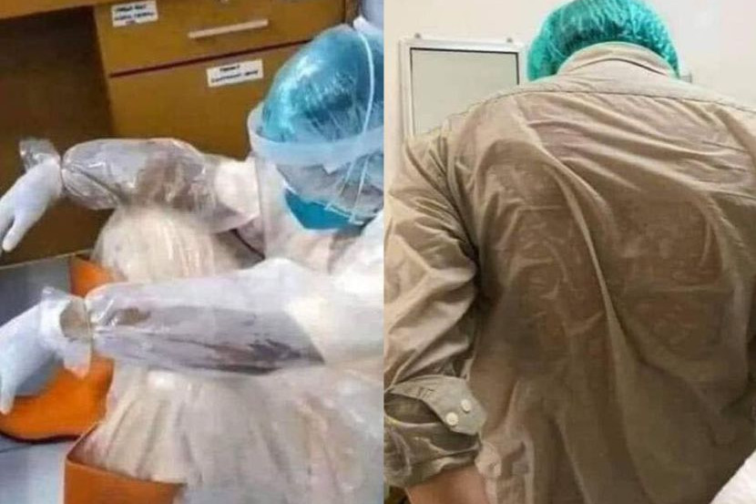Sementara itu sekeping gambar lain menunjukkan seorang petugas yang lencun dengan peluh ketika baharu menanggalkan PPE.