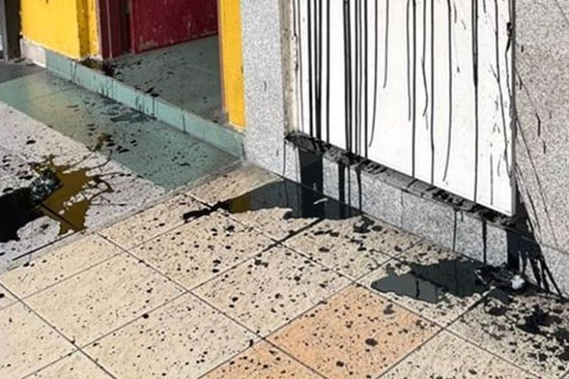 Cat disimbah pada papan tanda dan pintu hadapan kelab komedi tersebut yang turut mengenai premis bersebelahan.