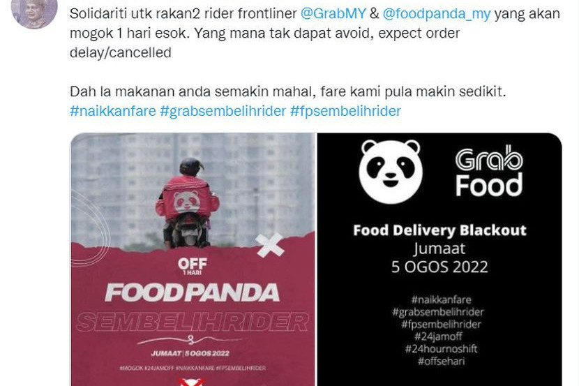“Solidariti untuk rakan-rakan rider frontliner @GrabMY & @foodpanda_my yang akan mogok satu hari esok. Yang mana tak dapat avoid, expect order delay/cancelled,” katanya.