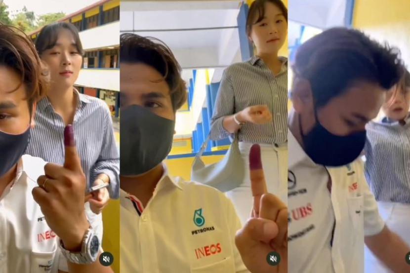 Ryzal menunaikan tanggungjawab sebagai pengundi sambil ditemani isterinya.