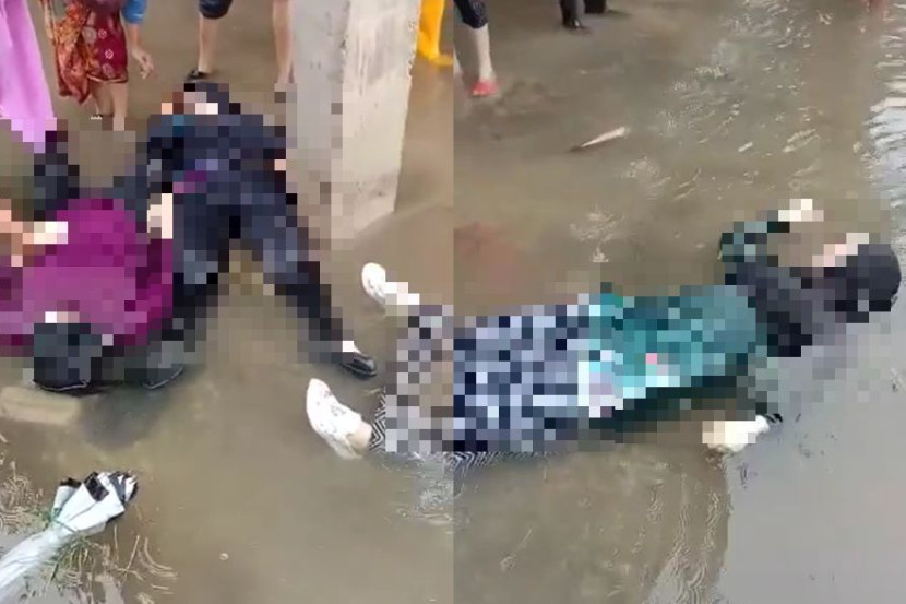Dalam video itu, tiga mangsa kelihatan terlentang dalam air banjir di halaman rumah mereka sambil dikerumuni beberapa individu.