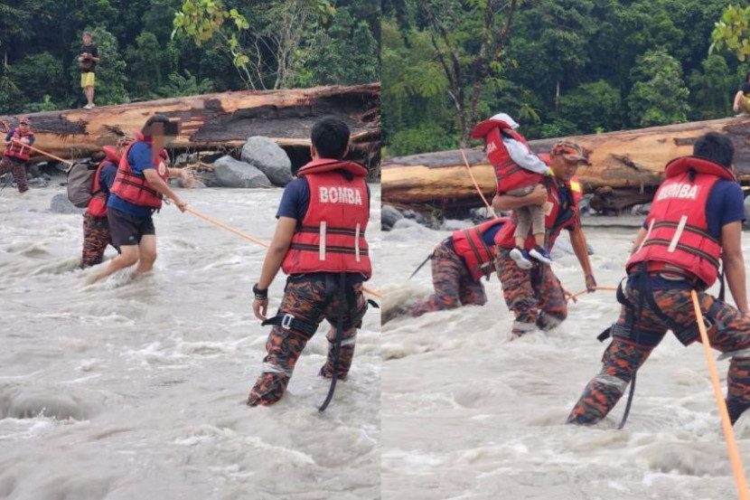 ANGGOTA bomba datang menyelamatkan 25 pelancong di sebuah resort di utara Sabah, Kota Belud yang terkandas selepas mereka terperangkap dalam air banjir yang menenggelamkan jalan.