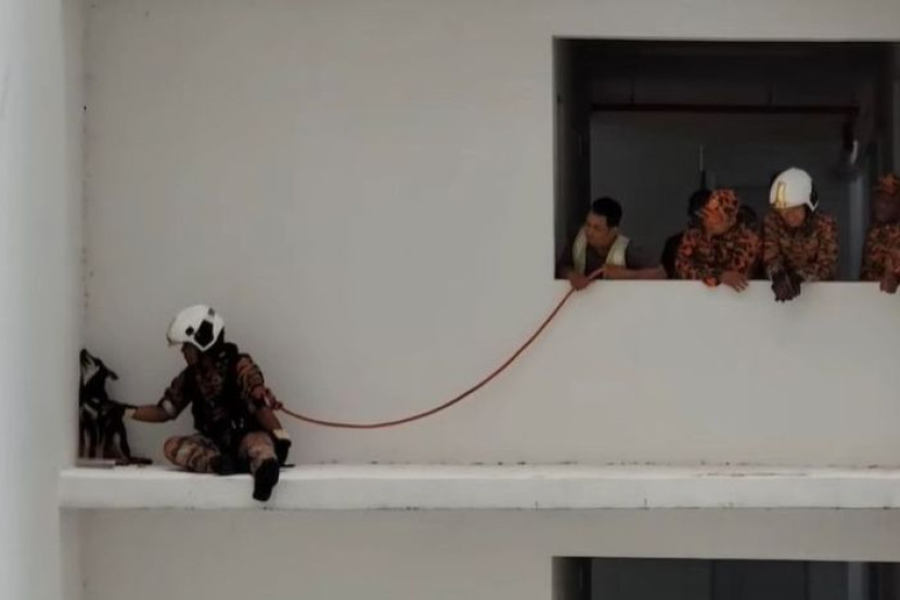 Kelihatan beberapa anggota bomba bersedia dari dalam bangunan sambil memegang tali keselamatan yang diikat pada salah seorang daripada mereka yang ditugaskan untuk mengambil anjing itu.