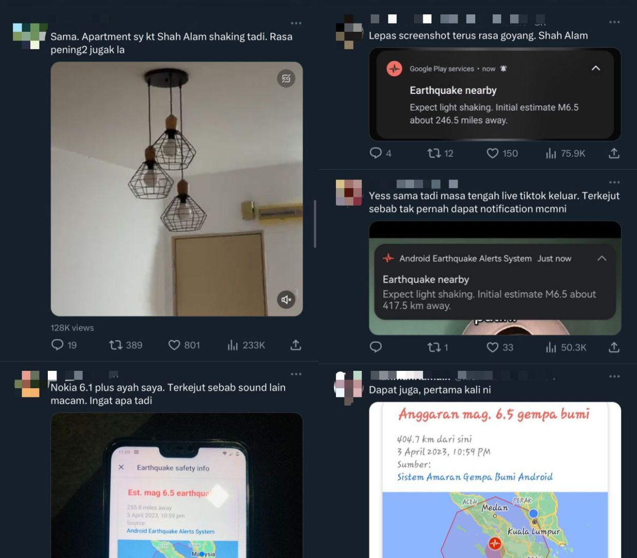 GEMPA bumi kuat bermagnitud 6.2 melanda Utara Sumatera, Indonesia pada 10.59 malam IIsnin, menurut Jabatan Meteorologi Malaysia (MetMalaysia). Menerusi portal METMalaysia, gempa bumi dengan kedalaman 86 kilometer itu berlaku pada jarak 84 kilometer barat daya dari Padang Sidempuan, Indonesia. Berdasarkan penilaian dibuat, gegaran di negara jiran itu mungkin turut dirasai di beberapa negeri di Perak, Selangor, Wilayah Persekutuan Kuala Lumpur, Wilayah Persekutuan Putrajaya, Negeri Sembilan, Melaka dan Johor. METMalaysia turut memaklumkan tiada ancaman tsunami kepada Malaysia susulan gempa yang berlaku. Semakan di laman sosial Twitter pula mendapati pengguna dari pelbagai lokasi turut merasai gegaran yang berlaku. Rata-ratanya turut berkongsi tangkap layar amaran awal gempa bumi dari sistem Android yang diterima menerusi notifikasi telefon pintar masing-masing. Pastinya perkara itu menimbulkan pelbagai reaksi dengan rata-rata menyoal kesahihan insiden itu. Komen netizen di Twitter. "Menerima notifikasi amaran gempa bumi di telefon pintar saya. Siapa yang menerima notifikasi sama?" soal pelayar @XavierNaxa menerusi ciapan di Twitter. Pelbagai reaksi dapat dilihat membalas ciapan asal tersebut. "Sama. Pangsapuri saya dekat Shah Alam bergegar tadi. Rasa pening-pening jugalah. "Ingatkan saya pening atau penat. Tapi tengok telefon ada notifikasi," ujar beberapa netizen. Sebagaimana dinyatakan, ini adalah maklumat akhir yang dikeluarkan oleh jabatan berkaitan kejadian gempa bumi tersebut melainkan jika terdapat perkembangan lanjut atau maklumat tambahan. Jadilah sebahagian daripada geng mStar! Follow kami di Telegram, Twitter, TikTok, Facebook, Instagram dan YouTube