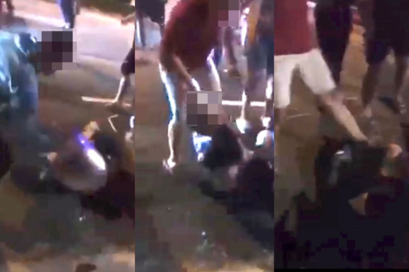 Tangkap layar sekumpulan suspek bertindak menarik rambut , menendang kepala dan memukul menggunakan topi keledar.