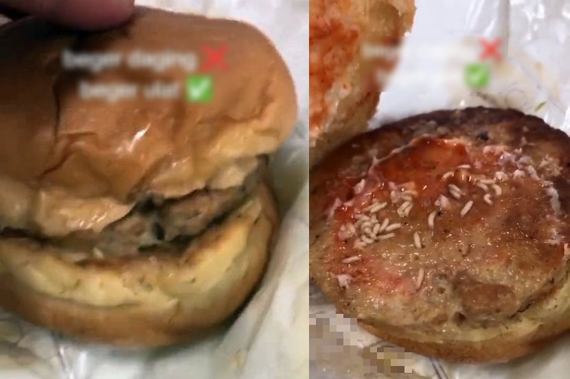 Menerusi video yang dimuat naik di laman sosial, kelihatan begitu banyak ulat berkeliaran di sebalik roti dan daging burger.