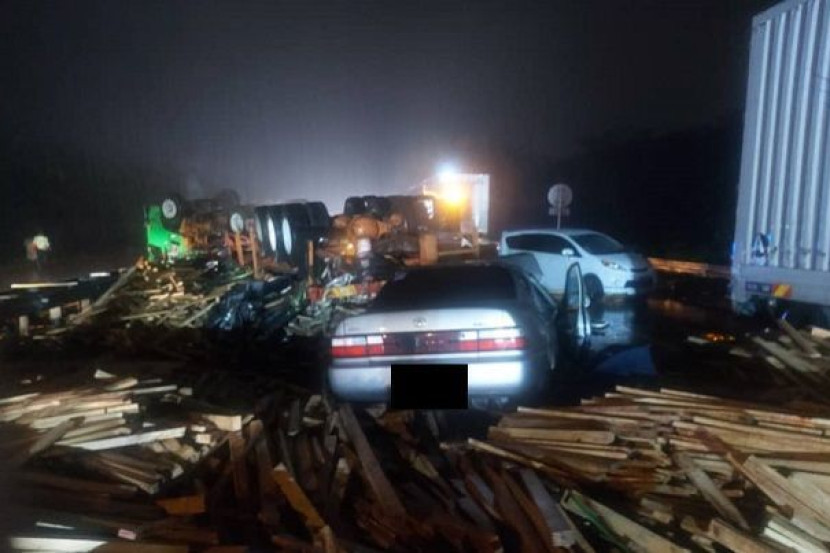 “Kemalangan berlaku kira-kira pukul 4 pagi itu menyebabkan salah sebuah treler yang sarat dengan kayu terbalik dan menghalang lebuh raya.
