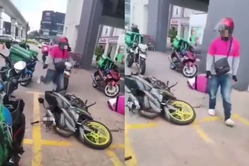 Menerusi video itu, pelaku yang memakai uniform t-shirt sebuah syarikat penghantaran makanan dilihat berulang kali menendang motosikal miliknya yang berada dalam keadaan terbalik di ruang parkir tersebut.