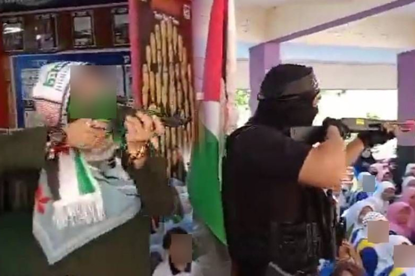 Bahkan beberapa orang guru dilihat membawa senapang mainan bersama dan mengarahkan ke arah murid-murid yang sedang duduk berhimpun.