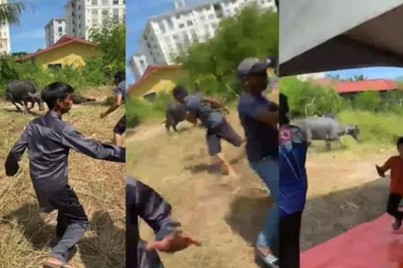 SEEKOR kerbau yang hendak dikorbankan terlepas sebelum ia mula menyerang orang ramai di Menggatal, Kota Kinabalu, Sabah. Seorang wanita dalam lingkungan 40-an turut patah kaki ketika kejadian. Sebelum itu, penduduk berkumpul di Surau Ar-Rahman Kampung Tobur untuk melakukan penyembelihan ibadah korban membabitkan lima ekor kerbau. Salah seekor kerbau bagaimanapun terlepas kira-kira pukul 9.30 pagi Selasa. “Salah satu tali yang menambat kerbau itu terputus dan ia terlepas. ARTIKEL BERKAITAN: Pengguna jalan raya kecoh, 2 ekor lembu lawan arus di LDP sehari sebelum Aidiladha “Kerbau itu kemudian berlari mengelilingi kawasan sembelihan dan menyerang penduduk kampung,” kata timbalan pengerusi surau Ali Osman Ismail. Tambahnya, mangsa yang cedera cuba menyelamatkan anaknya apabila haiwan itu menyerangnya. Ambulans kemudiannya dipanggil untuk membawa mangsa ke hospital. Terdahulu, satu video tular menunjukkan penduduk kampung yang panik cuba melarikan diri daripada kerbau yang mengamuk itu. Jadilah sebahagian daripada geng mStar! Follow kami di Telegram, Twitter, TikTok, Facebook, Instagram dan YouTube