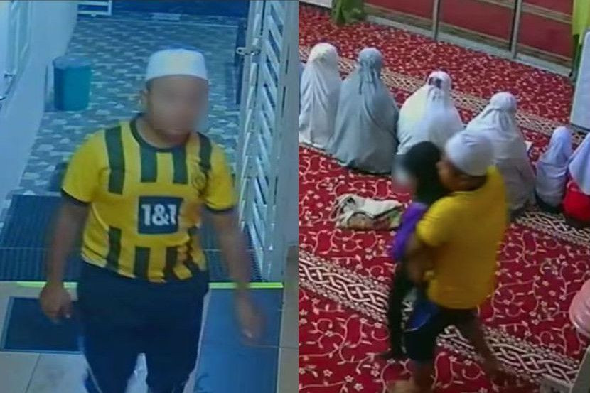 Dalam video yang dikongsikan, kelihatan suspek yang memakai baju berwarna kuning dan berkopiah mengangkat mangsa yang solat bersendirian di saf kedua jemaah wanita.