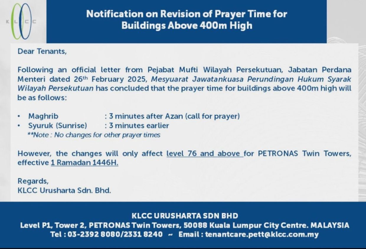 KEBIASAANNYA, umat Islam di negara ini akan menunaikan solat sebaik sahaja azan dilaungkan di kawasan masing-masing.Namun, ramai yang tidak tahu waktu solat juga boleh berubah apabila seseorang itu berada dalam bangunan yang tinggi. Di laman X, pengguna media sosial terkejut bercampur teruja melihat poster makluman waktu solat yang ditetapkan untuk tingkat 76 dan ke atas bagi Menara Berkembar Petronas di Kuala Lumpur.Menurut notis yang diterbitkan oleh pihak KLCC Urusharta dan kini tular, perubahan itu berkuatkuasa bermula 1 Ramadan.Ini bermakna, waktu berbuka untuk mereka yang berada di tingkat 76 ke atas juga berbeza dengan individu lain walaupun berada di bangunan dan kawasan sama."Kepada para penyewa, berdasarkan surat rasmi dari Pejabat Mufti Wilayah Persekutuan, Jabatan Perdana Menteri bertarikh 26 Februari 2025, Mesyuarat Jawatankuasa Perundingan Hukum Syarak Wilayah Persekutuan telah memutuskan bahawa waktu solat bagi bangunan yang melebihi 400 meter tinggi adalah seperti berikut:Maghrib: Tiga minit selepas azanSyuruk: Tiga minit lebih awalPoster makluman perubahan waktu solat yang tular di media sosial."Walaubagaimanapun, perubahan ini hanya akan terpakai bagi tingkat 76 ke atas di Menara Berkembar Petronas, berkuat kuasa 1 Ramadan 1446H," tulis kenyataan itu.Beberapa netizen meluahkan rasa terkejut memandangkan mereka tidak tahu waktu solat dan berbuka akan berubah apabila seseorang itu berada pada ketinggian tertentu."Baru tahu, lagi tinggi sebuah bangunan, lagi lambatlah waktu berbukanya."Jadi, hal sama turut terpakai untuk Menara TRX dan Merdeka 118?"Tak silap Burj Khalifa pun lagi banyak waktu dia, sebab level berbeza-beza. Konsep dia sama macam naik atas bukit."Ini adalah interesting fact (fakta menarik). Rupanya ketinggian pun main peranan dalam masuk waktu," tulis netizen.Dalam pada itu, semakan mendapati menara pencakar langit Burj Khalifa di Dubai juga mempunyai tiga zon waktu solat berbeza.Zon 1 melibatkan Aras 1 hingga 80, Zon 2 (Aras 81-50) dan Zon 3 (Aras 150 ke atas).
