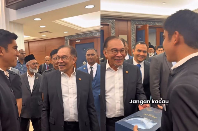 AHLI Parlimen Muar, Syed Saddiq Syed Abdul Rahman menyerahkan dua pasang baju Melayu kepada Perdana Menteri, Datuk Seri Anwar Ibrahim ketika mereka bertemu di lobi Parlimen, pada Selasa.Menerusi video yang dikongsi di media sosial, Syed Saddiq berkata dia mahu menghadiahkan dua pasang baju Melayu berwarna biru dan merah jambu buat Ahli Parlimen Tambun itu. "Datuk Seri, seperti dijanjikan, dua baju raya. Salah satunya warna kegemaran Datuk Seri iaitu warna Parti Keadilan Rakyat (PKR)."Lagi satu warna pink," kata Syed Saddiq kepada Anwar.Dalam pertemuan sama, Anwar juga sempat mengusik Syed Saddiq tentang desas-desus percintaannya dengan artis Bella Astillah. "Tapi, Bella kena ada sebelah," ujar Anwar yang juga Menteri Kewangan secara berseloroh. Syed Saddiq menghadiahkan dua pasang baju Melayu kepada Anwar.Syed Saddiq yang tersipu-sipu malu bagaimanapun menjawab semula usikan Anwar."Jangan kacau itu saya punya, kasi chance la Datuk Seri," jawab Syed Saddiq sambil tergelak.Tidak terhenti di situ, Anwar cuba bertanyakan tentang perancangan untuk bernikah."So bila ada... date dah siap ke?" soal Anwar pula, dipercayai merujuk kepada tarikh perkahwinan Syed Saddiq dan Bella.Syed Saddiq bagaimanapun memberi jawapan ‘selamat’."Kita doakan je la Datuk Seri, don't worry. Apa-apa, you will be the first one to know," jawab Syed Saddiq."Belum lagi lah?" soal Anwar pula pada penghujung video itu.