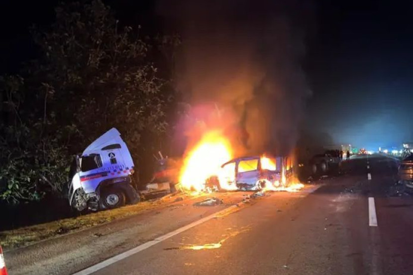 LIMA individu, termasuk seorang kanak-kanak berusia dua tahun, maut dalam kemalangan membabitkan sebuah treler dan tiga kereta di KM58.1 Lebuhraya Utara-Selatan di Kluang, Johor. Ketua Polis Daerah Kluang, Asisten Komisioner Bahrin Mohd Noh berkata, kejadian berlaku apabila tayar hadapan sebelah kanan lori tersebut meletup sekitar pukul 11.30 malam, Khamis. "Lori itu hilang kawalan dan bergesel dengan sebuah kereta sebelum memasuki laluan bertentangan lalu merempuh dua lagi kereta. "Salah sebuah kereta terbakar, namun semua penumpangnya berjaya dikeluarkan sebelum kenderaan itu dijilat api," katanya. Dia berkata, pemandu dan penumpang dalam sebuah lagi kereta maut di lokasi kejadian. "Seorang kanak-kanak perempuan berusia dua tahun yang berada dalam salah sebuah kereta turut maut di tempat kejadian, manakala ibu bapanya meninggal dunia dalam perjalanan ke hospital. "Tiga adik-beradiknya yang lain, berusia antara empat hingga sembilan tahun, mengalami kecederaan serius dan kini sedang dirawat di hospital," katanya, sambil menambah pemandu lori berusia 35 tahun itu mengalami kecederaan di kaki dan pinggul. Bahrin berkata, ujian saringan mendapati pemandu treler negatif dadah serta tidak mempunyai rekod jenayah. "Polis menahannya untuk siasatan lanjut," katanya, sambil menambah kes disiasat mengikut Seksyen 41(1) Akta Pengangkutan Jalan 1987 kerana menyebabkan kematian akibat pemanduan melulu atau berbahaya.