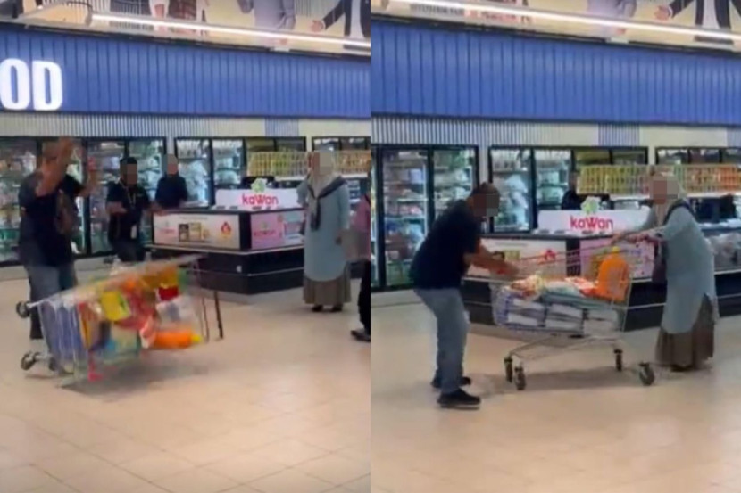 Dalam video tersebut, lelaki itu yang memakai topi dilihat mengherdik wanita yang berada dekat dengannya sebelum mencampak barang-barang yang diambil dari dalam troli.
