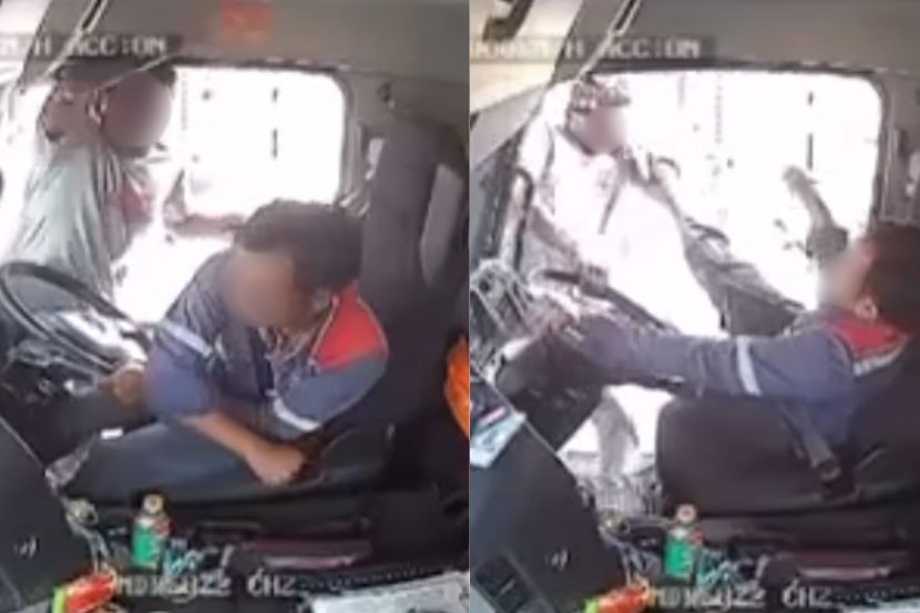 Dia bukan sekadar memanjat bahagian pintu pemandu, sebaliknya turut menyerang pemandu lori berkenaan dengan memukulnya bertubi-tubi di bahagian kepala.