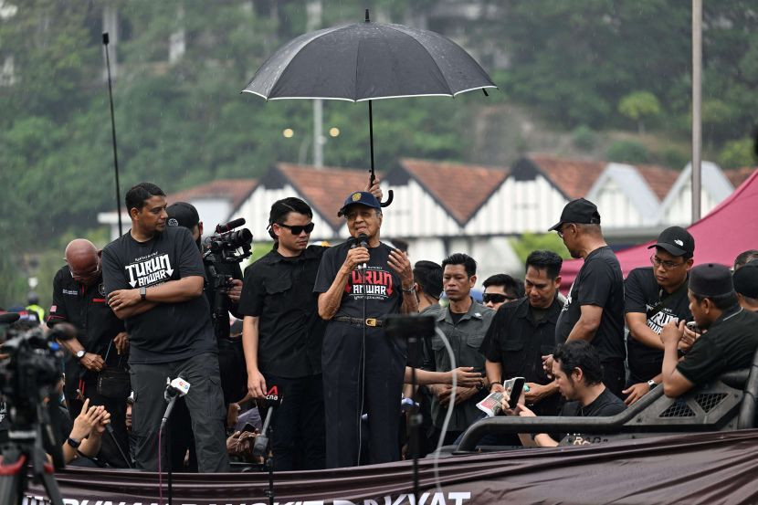Mengenakan kemeja-T berwarna hitam bertulis 'Turun Anwar', negarawan tersebut menjadi pemimpin terakhir yang menyampaikan ucapan di hadapan puluhan ribu peserta himpuan.