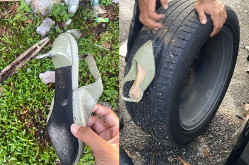 Namun, seorang wanita mengundang perhatian ramai apabila memuat naik foto memaparkan tayar keretanya yang tertusuk kasut tumit tinggi.