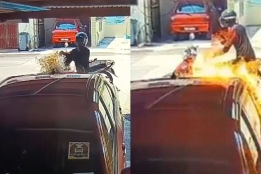 TINDAKAN seorang lelaki yang dipercayai cuba membakar dua kenderaan di sebuah rumah di Taman Bukit Katil Permai, Melaka hampir makan diri sendiri apabila motosikal yang ditungganginya turut disambar api, dalam kejadian pada Sabtu.