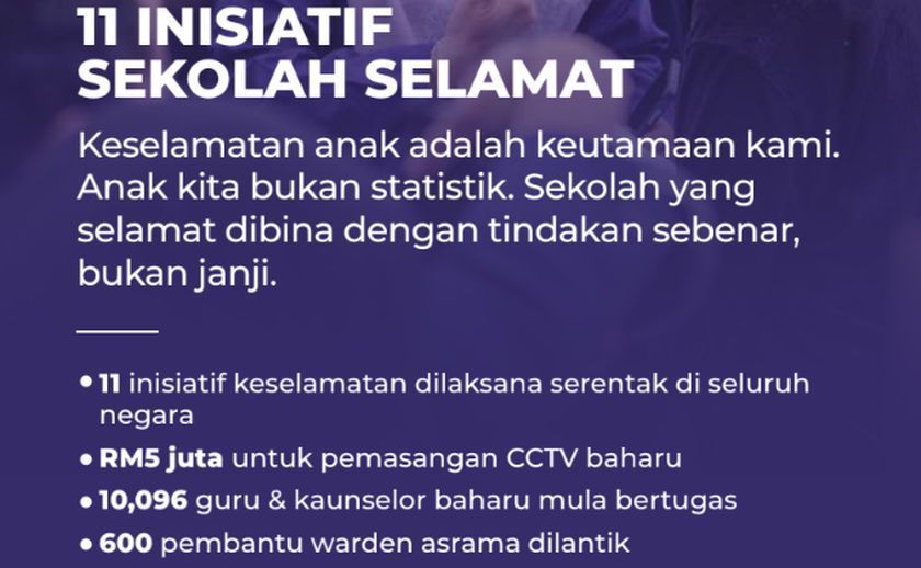 Dari segi keselamatan sekolah, Fadhlina berkata KPM sedang melaksanakan 11 inisiatif sekolah selamat secara serentak di seluruh negara, termasuk peruntukan RM5 juta bagi pemasangan kamera litar tertutup (CCTV), pelantikan 10,096 guru dan kaunselor baharu, serta 600 pembantu warden asrama.