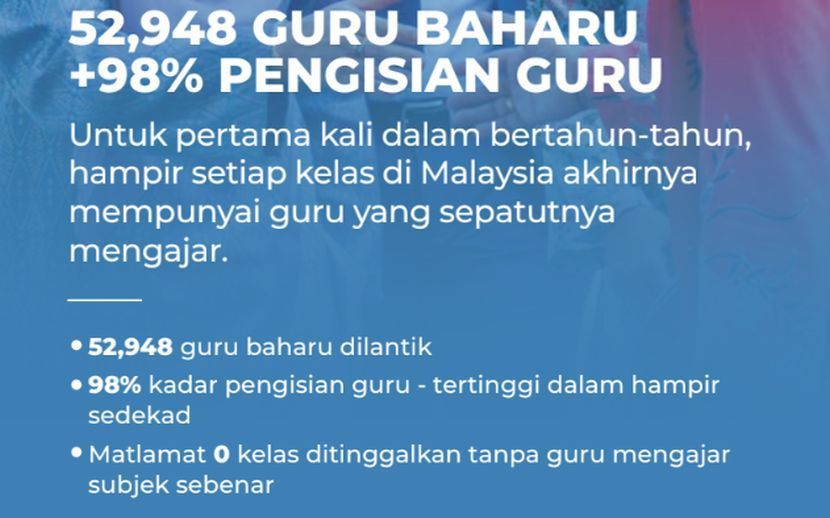 Pada masa sama, KPM berjaya mengisi hampir sepenuhnya keperluan tenaga pengajar dengan pengambilan 52,948 guru baharu, iaitu mencapai kadar pengisian sebanyak 98 peratus, kadar tertinggi dalam tempoh hampir sedekad.