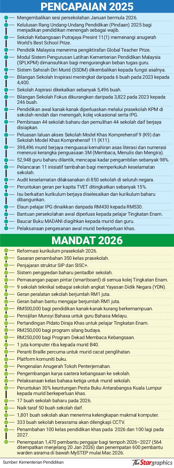 KEMENTERIAN Pendidikan Malaysia (KPM) sedang mendengar dan bertindak berdasarkan suara rakyat.Perkara ini, kata Menteri Pendidikan Fadhlina Sidek, menandakan era baharu kerjasama antara kementerian dan masyarakat Malaysia, yang mana setiap inisiatif dan dasar dipandu oleh pihak yang paling terkesan iaitu murid, guru, ibu bapa dan komuniti. “Pembangunan murid hanya bermakna apabila kita benar benar mendengar suara murid dan guru, kerana di situlah denyut nadi pendidikan berada.“Itulah sebabnya setiap aspirasi rakyat mesti diambil kira dan dipertimbangkan segera,” katanya ketika menyampaikan perutusan Tahun Baharu kepada warga kementerian di Putrajaya pada 9 Januari.Beliau berkata 2026 menandakan tahun penentu bagi pendidikan Malaysia, apabila kementerian komited untuk melaksanakan pembaharuan yang telah lama dirancang yang melangkaui fasa perintis dan janji, sekali gus memastikan dasar diterjemahkan kepada hasil yang boleh diukur untuk setiap kanak-kanak.“Kita mesti menjadikan tahun ini sebagai tahun kita kerana terdapat dua perkara yang sangat penting sedang berlaku.“Pada 2026, kurikulum prasekolah akan dilaksanakan dan kita juga akan melancarkan pelan tindakan pendidikan baharu.“Kedua-dua inisiatif ini mesti diberi tumpuan penuh dan kami akan terus memberi perhatian kepada isu pembangunan pendidikan melalui pendekatan berteraskan manusia yang sentiasa menjadi sebahagian daripada agenda kami,” katanya.Fadhlina turut menegaskan matlamat kementerian perlu disampaikan dengan berkesan kepada orang ramai supaya semua pihak dapat melihat dengan jelas bagaimana inisiatif ini membentuk dan memberi manfaat kepada keseluruhan ekosistem pendidikan.“Guru juga terlibat, begitu juga Pejabat Pendidikan Daerah (PPD) dan Jabatan Pendidikan Negeri (JPN). Mereka yang membuat keputusan di Kementerian Pendidikan berpengalaman sebagai guru, pegawai PPD dan JPN atau dalam kementerian itu sendiri.“Kami bukan sahaja berinteraksi dengan pihak berkepentingan, malah bekerjasama rapat dengan ibu bapa dan komuniti lebih luas bagi memastikan kejayaan program sekolah kami tahun ini,” katanya.Mengutamakan nilai kemanusiaanMenurut Fadhlina, walaupun peraturan dan garis panduan adalah perlu, mesti ada perbezaan yang jelas antara penguatkuasaan dan keutamaan terhadap nilai kemanusiaan yang melindungi kepentingan murid, pendidik dan komuniti pendidikan secara keseluruhan.“Itulah sebabnya walaupun kita sentiasa mahu menjadikan pendidikan kita berperikemanusiaan, ia tidak akan berjaya jika pentadbiran kita tidak berperikemanusiaan,” katanya sambil menambah pengajaran daripada tahun 2025, yang ditandai dengan tragedi signifikan, telah membentuk pembaharuan segera kementerian.Beliau menekankan kepentingan kesedaran dan tanggungjawab sebagai manusia.“Apa yang kita pelajari tentang kesihatan mental, yang merupakan sebahagian daripada pembaharuan segera kami, ialah ia bukan sahaja perlu disokong di peringkat komuniti tetapi juga sebagai satu pasukan.“Itulah sebabnya tumpuan kami pada waktu itu adalah untuk memastikan kami menangani kesihatan mental semua pihak secara bersama,” katanya sambil menambah kementerian telah menubuhkan jawatankuasa khas yang memberi tumpuan kepada 11 inisiatif bagi memperkukuh keselamatan sekolah dan menangani isu disiplin pelajar di semua institusi pendidikan.Kementerian bekerjasama rapat dengan ibu bapa dan komuniti lebih luas bagi memastikan kejayaan program sekolah.Beliau juga menyatakan pelbagai cadangan termasuk saranan bertulis, protes, demonstrasi, memorandum dan bantahan telah dikemukakan kepada kementerian bagi menambah baik inisiatif serta proses membuat keputusan.“Kementerian menerima semua ini dengan niat baik, berinteraksi secara terbuka dan sepenuh hati untuk terus mendengar dan memberi respons,” tambahnya.Beliau berkata garis panduan keselamatan sekolah akan diperkukuh melalui kerjasama dengan Polis Diraja Malaysia, Kementerian Kesihatan, Institut Keselamatan dan Kesihatan Pekerjaan Negara Negara serta komuniti setempat.“Teras garis panduan ini ialah jawatankuasa 3K iaitu Kebersihan, Kesihatan dan Keselamatan. Tumpuan kami tahun ini adalah untuk memastikan pelaksanaan 3K ini khususnya bagi keselamatan sekolah.“Kali ini, kami menambah baiknya dengan melibatkan pelajar, mengangkat suara mereka dalam jawatankuasa 3K bersama anggota komuniti dan pihak berkepentingan lain,” katanya.Memperkasa guruFadhlina turut menekankan kepentingan sokongan, pembangunan profesional dan beban kerja yang adil untuk pendidik.Bagi menangani perkara ini, beliau berkata kementerian telah mengambil langkah berperingkat untuk mengurangkan beban tugas guru termasuk menempatkan 1,470 pembantu pengajar dan 600 pembantu warden asrama di bawah Program Pekerjaan Jangka Pendek Malaysia (MySTEP).“Langkah ini dilaksanakan supaya guru dapat kembali memberi tumpuan kepada tugas teras mereka iaitu mengajar,” katanya.Beliau juga memaklumkan beberapa elemen pembaharuan akan diperkukuh tahun ini termasuk memperkasa suara pelajar, memahami bagaimana pelajar menyokong guru dan memperkenalkan maklum balas pelajar terhadap prestasi pentadbir.“Setakat ini, hanya pentadbir menilai prestasi guru. Kali ini, guru juga akan dapat menilai prestasi pentadbir.“Ini memastikan timbal balik dan mengembalikan suara guru serta pelajar, sekali gus membolehkan kami melihat sama ada pembaharuan dilaksanakan dengan berkesan di peringkat akar umbi,” katanya.Mengenai kepimpinan sekolah dan pembangunan guru, Fadhlina berkata perlu ada tumpuan berterusan untuk memperkukuh profesionalisme di sekolah khususnya dalam kalangan mereka yang memimpin dan melaksanakan pembaharuan.“Perkara paling penting ialah melahirkan lebih ramai pengetua dan guru besar berkualiti, serta pemimpin yang mampu melaksanakan proses pembaharuan dengan berkesan,” katanya.Beliau menambah 2026 juga akan menyaksikan penyelarasan struktur Rakan Penambahbaikan Sekolah (SIP) dan Jurulatih Pakar Pembangunan Sekolah (SISC+) dengan tadbir ur