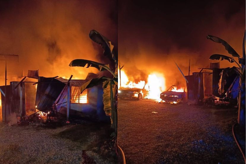 Kebakaran turut memusnahkan tiga kereta dan tiga motosikal. -Gambar Jabatan Bomba dan Penyelamat Pahang
