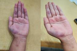 Kesan bengkak dan lebam pada tangan seorang murid Tahun Dua selepas didakwa dirotan guru di sekolah. -Gambar Facebook