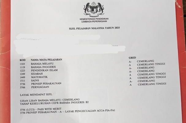 KESEDIHAN seorang remaja yang kematian ibunya sebelum sambutan lebaran bagaikan terubat apabila dia menerima keputusan cemerlang dalam peperiksaan Sijil Pelajaran Malaysia (SPM).Menerusi hantaran di Thread, Jamilah Ismail memaklumkan anak saudaranya yang dikenali sebagai Arissa itu meraih keputusan cemerlang 8A selepas ia diumumkan pada Selasa. "Tahniah Arissa. Ujian emak meninggal tiga hari sebelum raya baru ni. Ujian sakit kanser. Tidak sempat mak tengok keputusan SPM kakak.Keputusan SPM Arissa yang dikongsi oleh ibu saudaranya menerusi Thread."Anak suadara yang kehilangan ibu, sedih bercampur gembira apabila dapat keputusan 8A," tulis Siti Jamilah.Dalam hantaran sama, Siti Jamilah memuat naik video [Tonton Video] memaparkan Arissa menangis sambil dipeluk beberapa individu ketika menerima keputusan SPM.ARTIKEL BERKAITAN: Kejayaan adik buat rider nekad ulang SPM, impi kerja bidang ‘oil and gas’! Rupanya dah 4 kali daftar jadi calon ulanganARTIKEL BERKAITAN: Dua tahun lalu acah dapat 11A, kini betul-betul jadi pelajar terbaik SPM 2021! Tapi netizen tertarik perubahan pokok di belakangDia turut berkongsi foto Arissa yang merakam swafoto di pusara ibunya.Berdasarkan slip keputusan yang dikongsi, Arissa mengambil lapan subjek iaitu bahasa Melayu, Inggeris, Pendidikan Islam, Sejarah, Matematik, Sains, Prinsip Perakaunan dan Perniagaan.Netizen di aplikasi Thread turut menghujani hantaran itu dengan ucapan tahniah serta mendoakan Arissa terus kuat menjalani kehidupannya."Tahniah Arissa, emak kamu mesti sangat bangga dengan keputusan ini. Jaga diri."Dia akan jadi wanita yang hebat dan berdikari suatu hari nanti. Semoga berjaya."Tahniah dik, moga jadi anak solehah cemerlang dunia akhirat," tulis netizen.