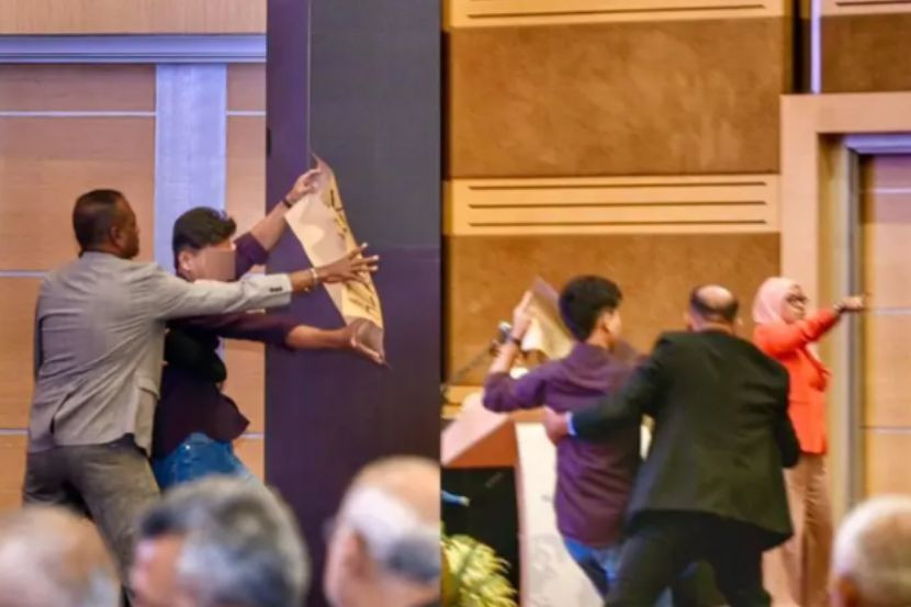 SESI ucaptama Ketua Pesuruhjaya Suruhanjaya Pencegahan Rasuah Malaysia (SPRM), Tan Sri Azam Baki, terganggu apabila dua lelaki memasuki dewan sambil membawa sepanduk di Pusat Dagangan Dunia (WTC) pada Selasa.Suasana dewan menjadi tegang apabila salah seorang individu tersebut menjerit sambil bergegas ke bahagian hadapan pentas, sekali gus mencetuskan kekecohan dalam kalangan hadirin. Bagaimanapun, petugas keselamatan bertindak pantas mengawal keadaan sebelum mengiringi lelaki tersebut keluar dari dewan. Seorang lagi individu dilihat berada di bahagian belakang sambil mempamerkan sepanduk.Walaupun berlaku gangguan, Azam kekal tenang dan profesional dalam mengendalikan situasi itu, malah sempat menceriakan suasana dengan kenyataan spontan.“Jangan tukar saluran televisyen,” katanya berseloroh sebelum meneruskan ucapan.Insiden itu berlaku ketika Azam sedang menyampaikan ucapan utama sempena program Wacana Ilmiah Perdana.Wartawan di lokasi melaporkan kedua-dua individu terbabit memakai baju-T tertera perkataan “Mandiri”.Difahamkan, kumpulan sama merancang mengadakan perhimpunan pada 25 April ini di Dataran Merdeka bagi menuntut siasatan lebih telus berhubung isu dakwaan pemilikan saham melibatkan Azam.Selain dakwaan kewujudan ‘mafia korporat’ yang dikatakan menjejaskan reputasi SPRM.Setakat ini, butiran lanjut mengenai identiti individu terbabit serta sama ada sebarang tangkapan dibuat masih belum diperoleh. -The Star