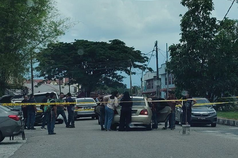 Polis menjalankan siasatan di lokasi kejadian tembakan yang meragut nyawa tiga individu. -Foto media sosial