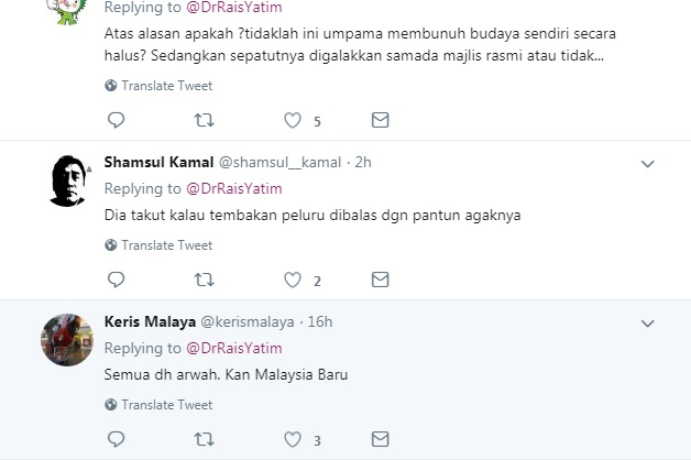 "Atas alasan apakah? Tidaklah ini umpama membunuh budaya sendiri secara halus? Sedangkan sepatutnya digalakkan sama ada majlis rasmi atau tidak," tulisnya.