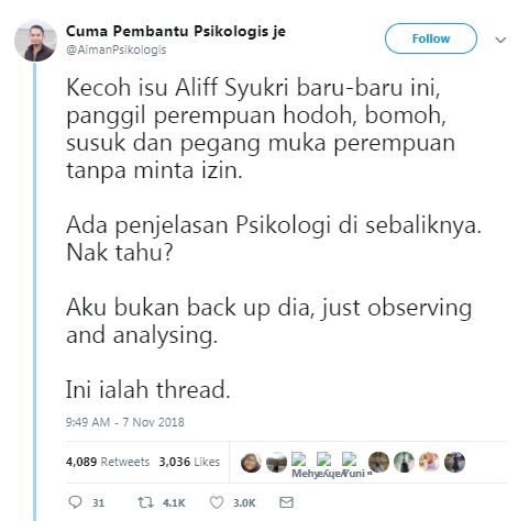 "Ada penjelasan psikologi di sebaliknya. Nak tahu? Aku bukan sokong dia, hanya memerhati dan menganalisis," katanya.