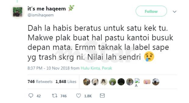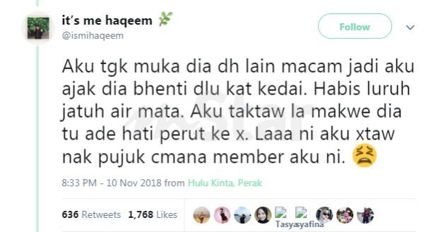 “Bergegas habis peperiksaan, terus ke bandar dengan aku naik motor petang tadi. Dalam perjalanan balik, dia ternampak makwe (kekasih) dia gelak sakan dengan lelaki lain dalam kereta kat (persimpangan) lampu isyarat,” tulis seorang pemuda menerusi laman sosial Twitter @ismihaqeem pada Sabtu malam.
