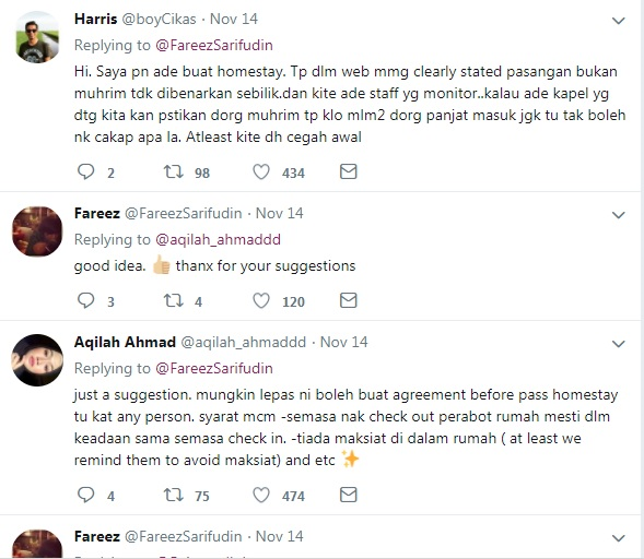 Menurut Fareez, walaupun dia sering mengutamakan kehendak penyewa, tetapi itu bukan bermakna mereka boleh datang ke homestaynya untuk melakukan maksiat.