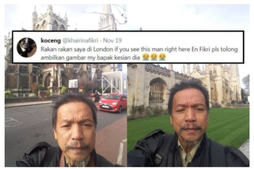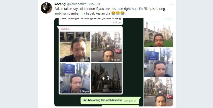 "Rakan-rakan saya di London jika anda ternampak lelaki ini, Encik Fikri please tolong ambilkan gambar my bapa, kesian dia," tulis Siti Khairina Mohd Fikri sehingga menerima lebih 6,000 ulang kicau (retweet)