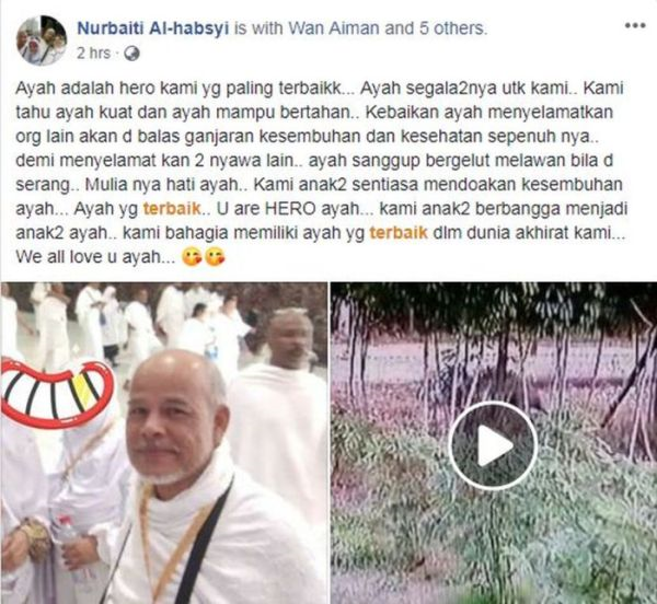 “Ayah sanggup bergelut melawan babi hutan bila diserang. Mulianya hati ayah. Kami anak-anak sentiasa mendoakan kesembuhan ayah. Ayah yang terbaik.