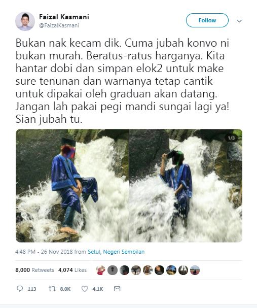 "Jangan lah pakai pegi mandi sungai lagi ya! Sian jubah tu," tulis @FaizalKamsani sambil menyertakan dua foto pelajar tersebut.