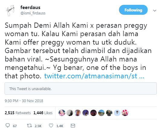 "Gambar itu menampakkan kami tidak bertolak ansur terhadap wanita hamil itu, sedangkan wanita itu sudah diberi tempat duduk selepas kami menyedari kehadirannya," kata pemuda berusia 23 tahun itu.