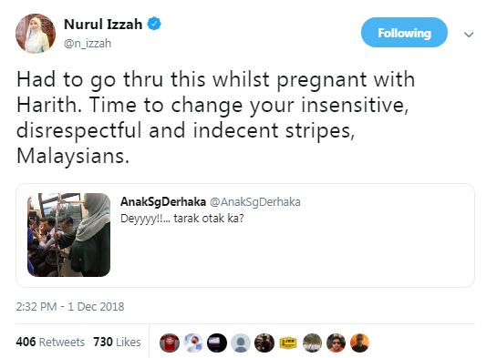 "Ada orang tegur, weh ada wanita hamil tengah berdiri. Kami pun terus cakap "duduk" kepada wanita itu," katanya.
