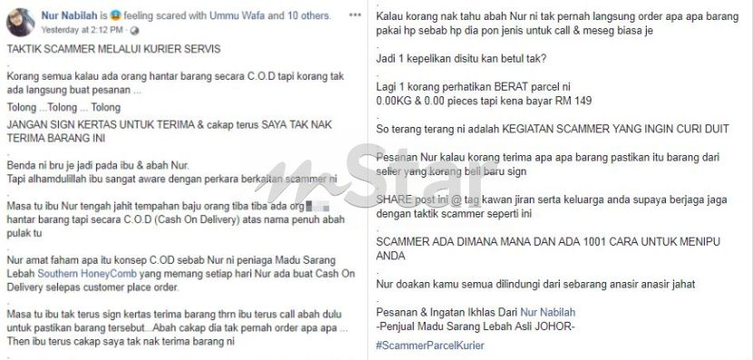 Anak sulung daripada tujuh beradik itu pada Khamis memuat naik hantaran di Facebook untuk menceritakan insiden seorang pekerja perkhidmatan kurier yang didakwa menghantar bungkusan ke alamat rumah orang tuanya, namun barang tersebut tidak pernah dipesan.