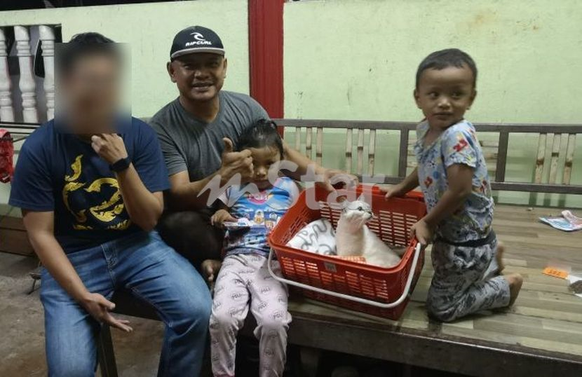 Suami Mimie (kiri) yang enggan dikenali bergambar bersama penyelamat kucing mereka, Arnis (dua dari kiri) di rumahnya di Klang.