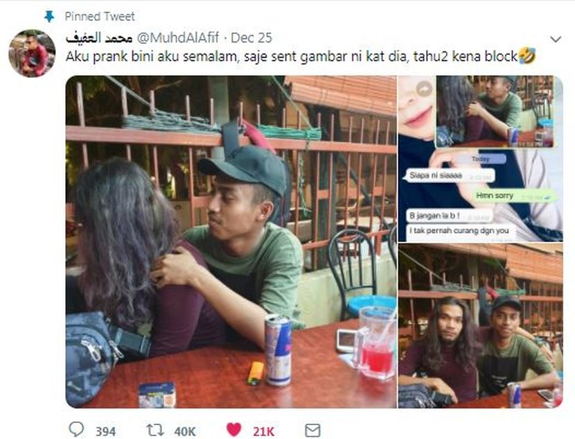 "Jadi saya tangkap gambar dan hantar kepada isteri. Lepas tengok terus dia merajuk. Bila dia block WhatsApp, saya mesej menggunakan (Direct Message) DM Instagram untuk hantar gambar sebenar kawan saya tu," jelas Al Afif.