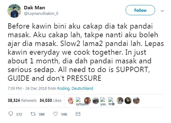 Bagaimanapun, jejaka berusia 24 tahun itu berkata dia sentiasa memberi sokongan kepada isterinya untuk belajar memasak.