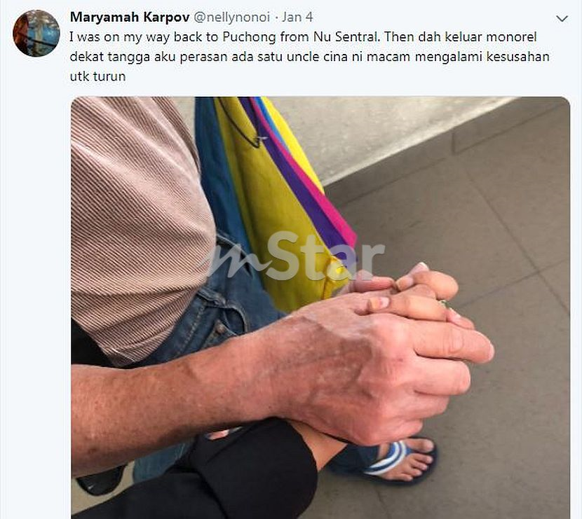 "Saya perasan ada seorang kakak asyik panda ke arah uncle tersebut yang berbangsa Cina. Jadi, saya pun melihat ke arahnya juga dan nampak dia macam susah nak turun tangga tu.