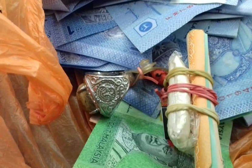 Penggunaan tangkal yang didakwa dijumpai dalam tabung yang digunakan oleh individu yang memungut derma tanpa kebenaran. - Foto Twitter @999malaysia