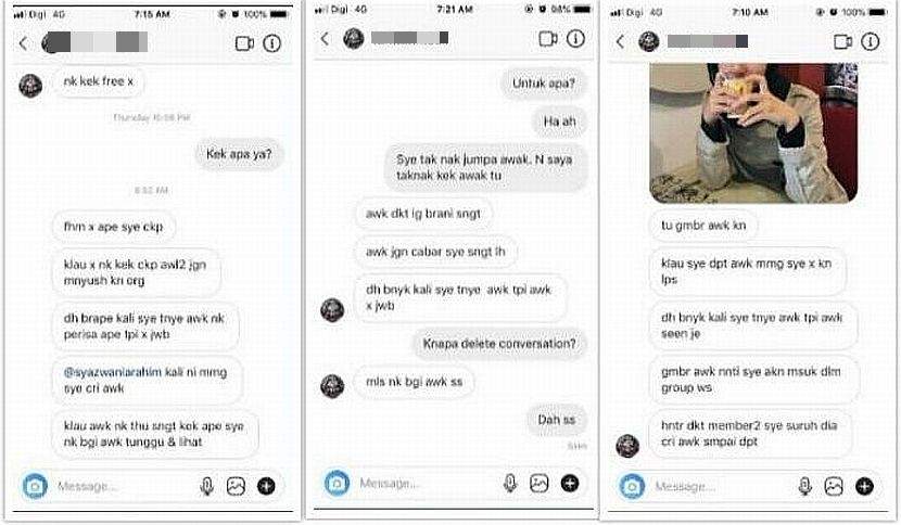 "Saya hanya diam dan dia bertambah berani mengugut nak cari saya. Malah dia juga hantar gambar saya kepada saya sendiri.