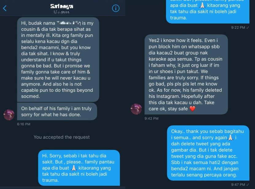 "Memang menakutkan caranya itu. Saya kongsi kes ini di Twitter dan rupa-rupanya ada juga mangsa lain yang kena kacau dengan lelaki ini," katanya.