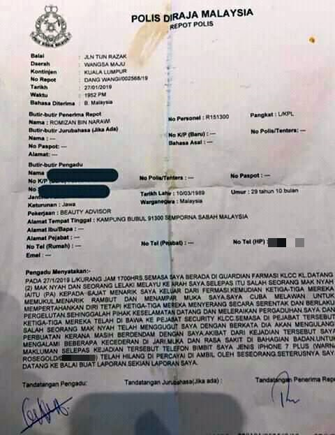Difahamkan jurujual yang berasal dari Sabah itu sudah membuat laporan berhubung insiden tersebut di Balai Polis Jalan Tun Razak, Kuala Lumpur pada hari sama.